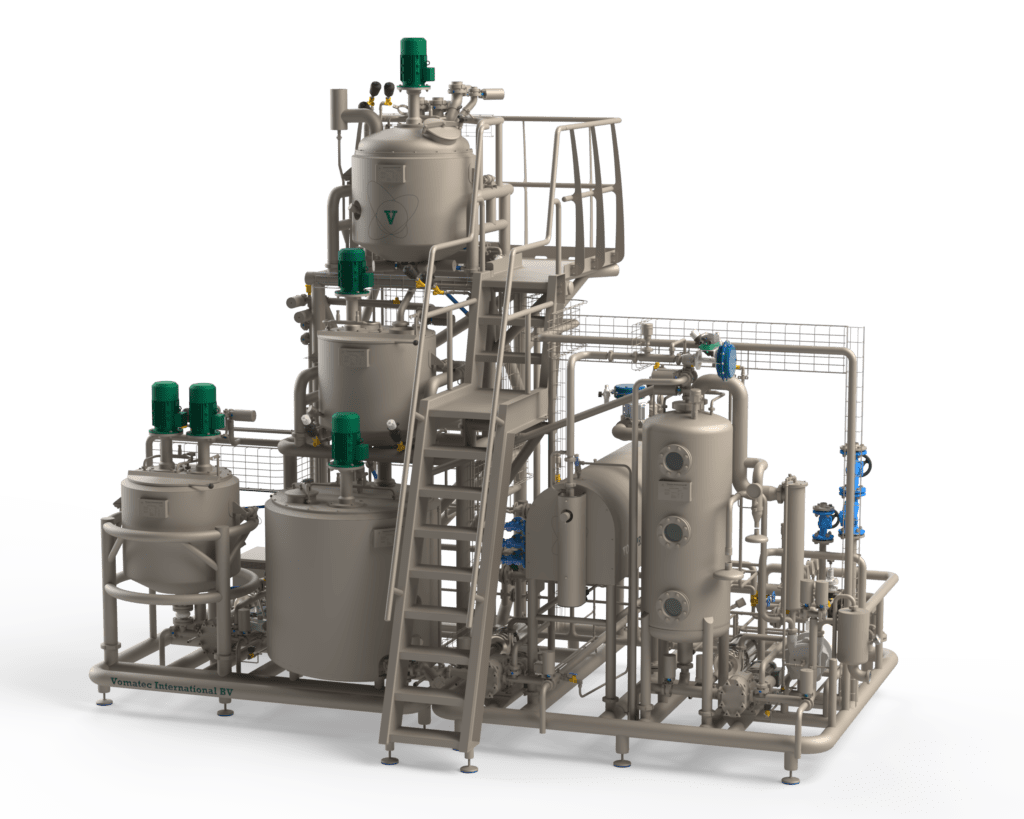 Archival photo of an early Vomatec confectionery system with stainless steel tanks and piping